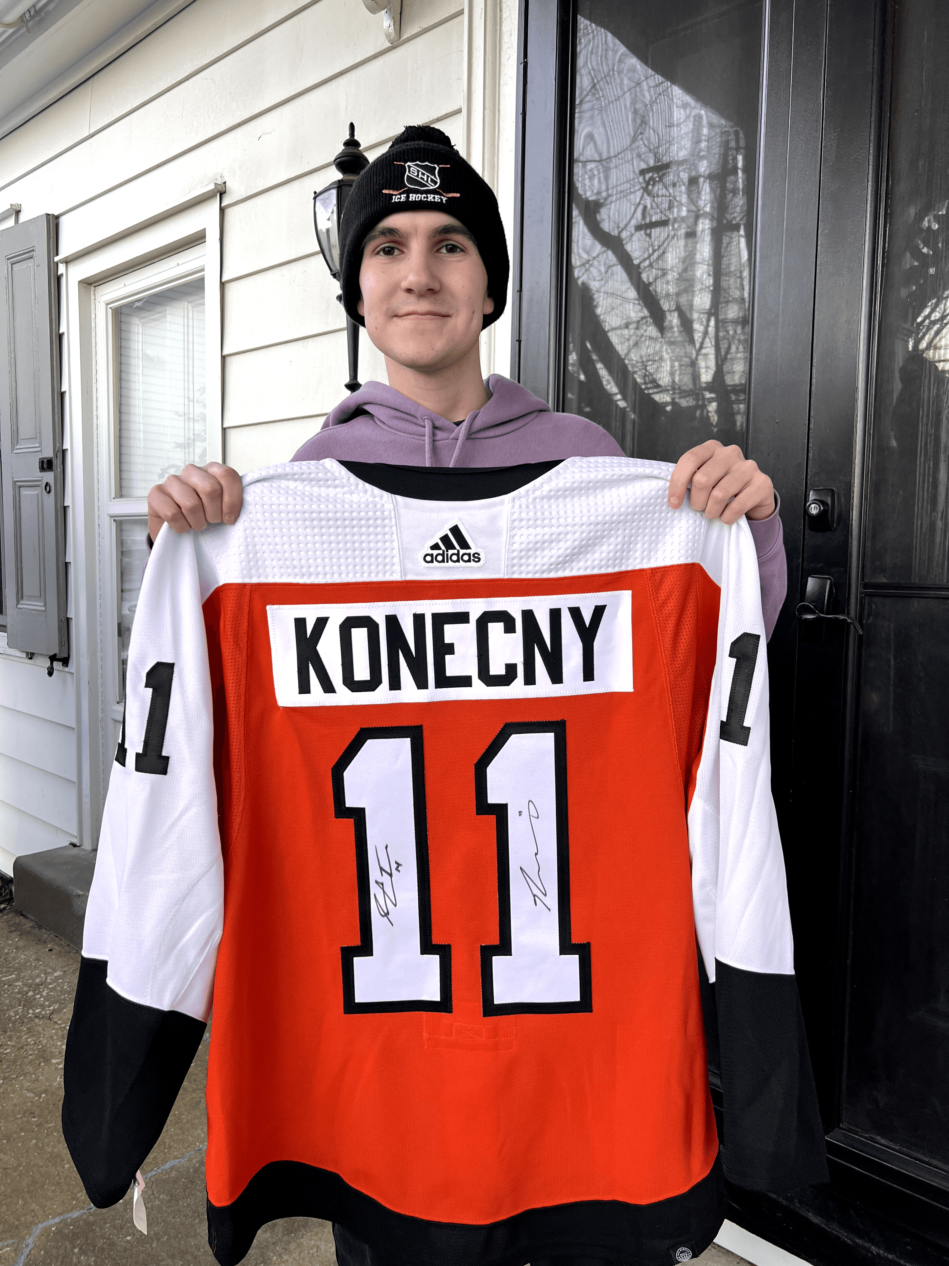He particularly enjoys watching forward Travis Konecny and captain Sean Couturier in action. When the Flyers heard this, they provided a Konecny jersey signed by both players!